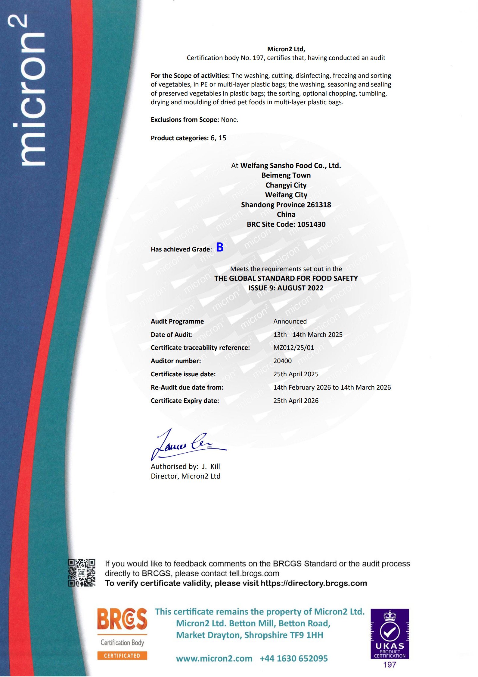 The company has passed the BRC certification, IFS certification, BSCI certification and also the EU registration, the Russia registration, and registration in Australia.